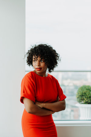 African American woman in red blouse leaning on wooden table in office, clasping hands copy space. Professional, corporate, serious, contemplative, modern, urban, focused