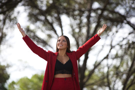 Close up portrait of laughing beautiful woman with long black hair standing next to a modern building. Girl in red jacket in the city. Real people