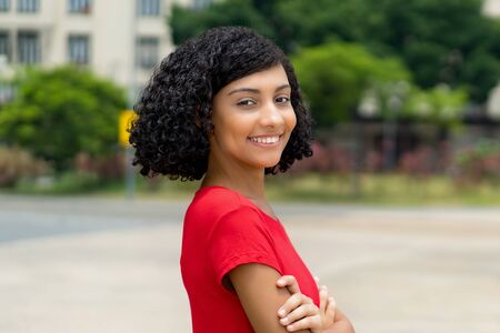 Smiling brunette woman in red blouse with crossed arms looking at the camera over black background