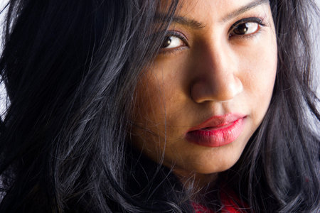 Cute girl face, white skin and green eyes, red lips black hair, look at sexy camera
