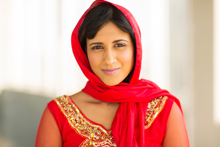 Blue shiny sky with a small white cloud behind a beautiful Indian woman