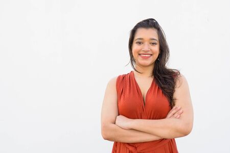 Happy young beautiful Indian woman smiling with arms crossed against white background
