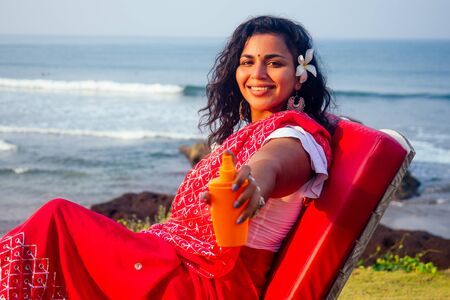 portrait of a beautiful and smiling snow-white smile indian woman black curly hair and dark skin in a red sari holding bottle of sunscreen spray on beach.girl enjoying spf body paradise vacation.