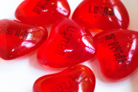 Red hearts on a purple background. Selective focus