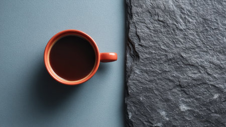 A top-down view of an orange coffee cup filled with dark liquid resting next to a textured slate surface, perfect for lifestyle or product photography showcasing comfort and elegance.