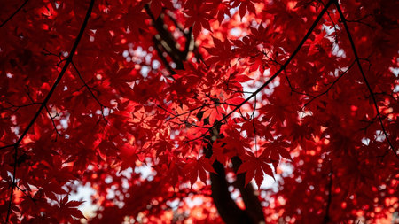 A red maple fall brings during autumn beside season deep evoking stillness detail golden sunlight illuminating the full scene looking leaves filtering creates glowing edges.