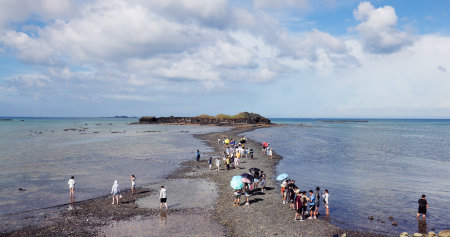 Penghu, Taiwan 25 June 2022: Low tide walking path connect Kueibishan and Chi Yu Island at Penghu of Taiwan