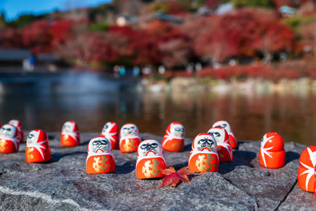 Daruma dolls with red maple leaf by pond in autumn of Katsuo-ji temple, Minoh, Osaka, Japan. Famous travel destination for sightseeing Kansai in fall. Temple of victory.