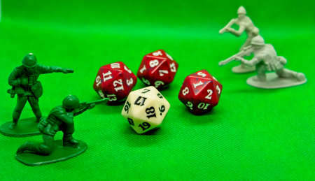Dice of role-playing and figures of soldiers with a green background