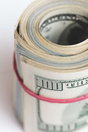 rolled into a tube and tied with a rubber band paper notes American dollars as part of the world economic system