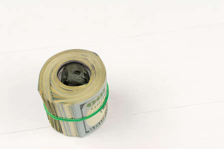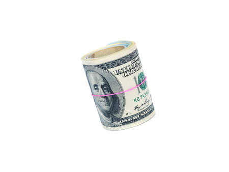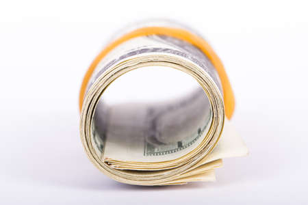 100 dollar bills twisted into tube and tied with an elastic band. white background, copy space for your text