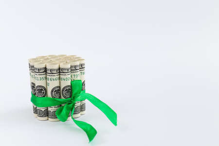 100 dollar bills in rolls tied with green ribbon. Money gift.