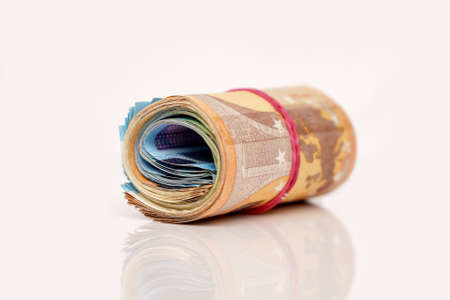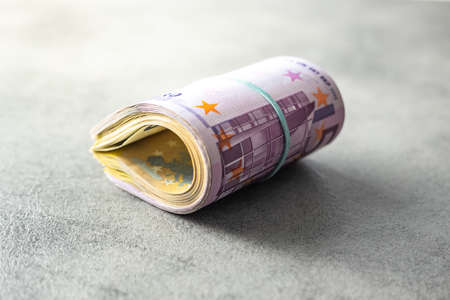 Close up of Euro money roll. Euro banknote set cash money - EU currency. Rolled with rubber euro notes. Business budget of wealth and prosperity finance. Banknotes stacked on each other in different positions.