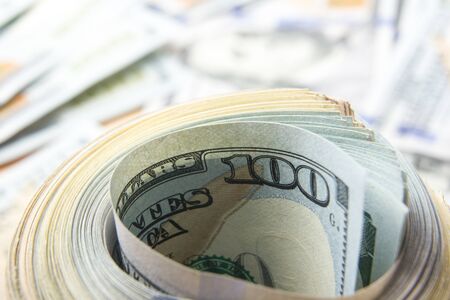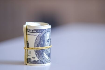 American one hundred dollar banknotes rolled up as a tubule. Light background, closeup, selective focus