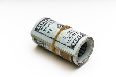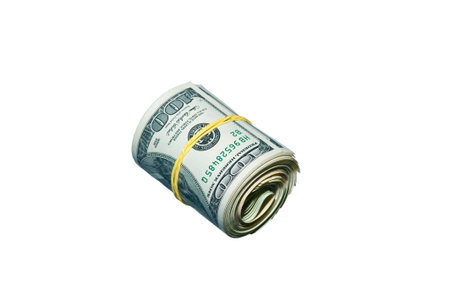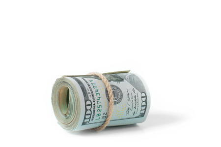 Roll of one hundred dollar banknotes, isolated on white background.