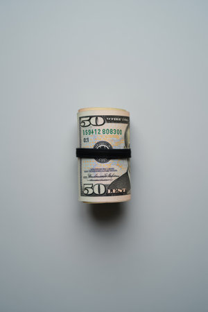 A roll of fifty-dollar bills is neatly secured with a black rubber band. The money is displayed on a plain white surface, emphasizing its organized presentation