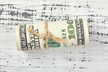 Close up dollar bills roll with rope paste on wooden desktop. Saving money conceopt.