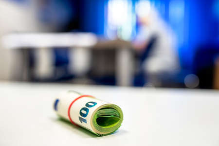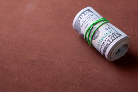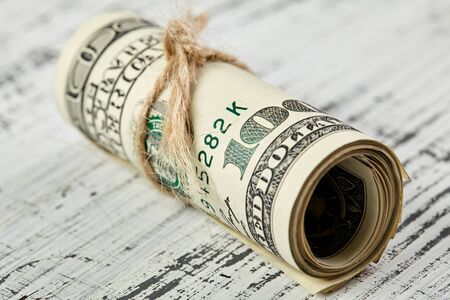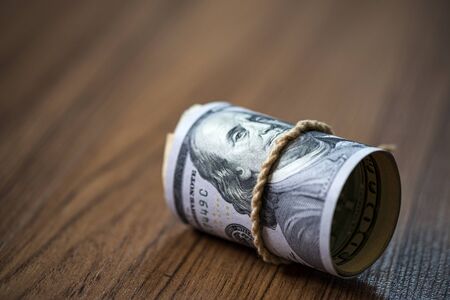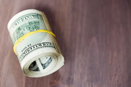 Macro of Roll of 100 US dollar banknote on wooden background and copy space. US dollar is the main exchange currency in the world.