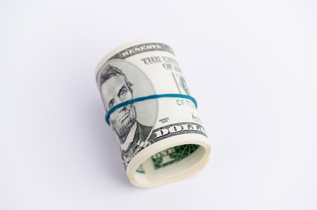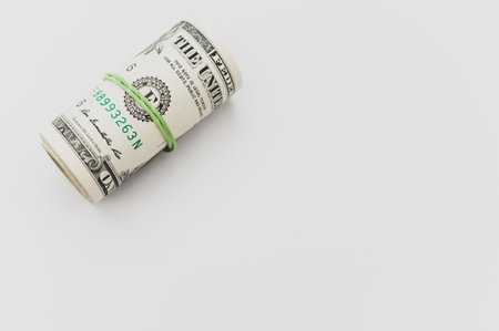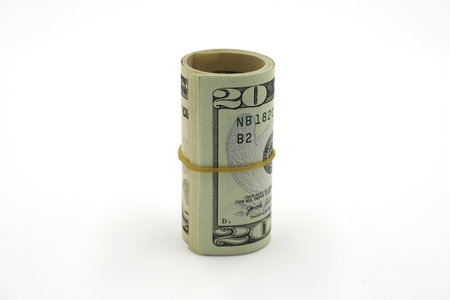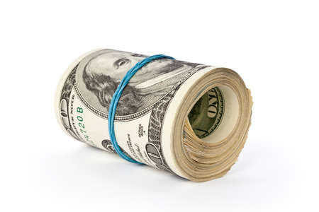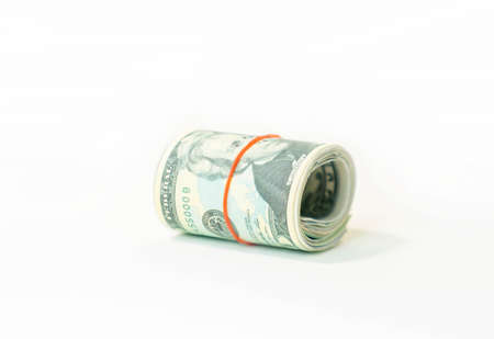 Dollar roll tightened with band. Rolled money on white