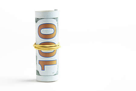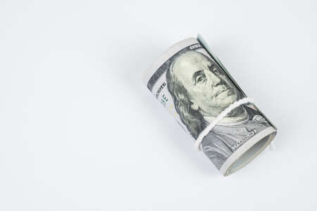 Roll of one hundred US dollar banknotes with white robe isolated on white background.