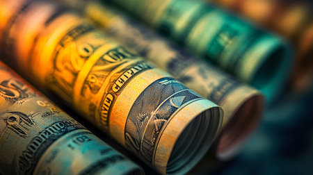 A close-up image of rolled banknotes, vividly colored and arranged in a line, symbolizing currency, wealth, finance, and economic concepts of money management.