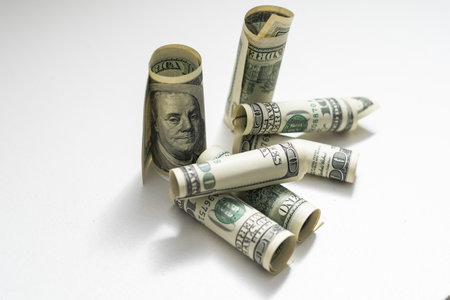 US dollar banknotes rolled up on a white tabletop with text space
