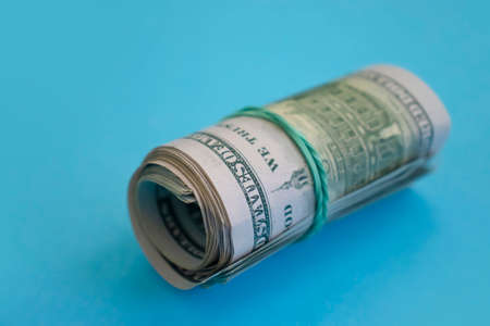 Rolls of American dollar bills on blue background
