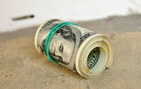 American dollar is the official currency of the United States of America with copy space. Roll of money, twisted rubber bands