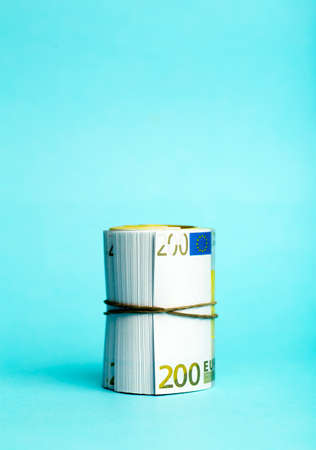Money and income concept. Euro cash banknotes on a blue background. Saving and spending money