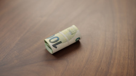 Banknotes of 50, 20 and 10 euro in rolls close up isolated on light pastel background