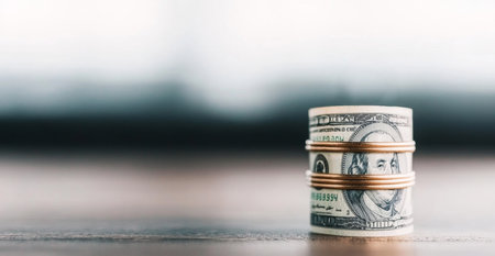 A row of rolled hundred dollar bills with rubber bands on dark background
