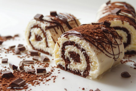 This stunning image showcases an artistic presentation of chocolate roll cake slices surrounded by rich chocolate shavings and creamy decorations, ideal for any sweet tooth.