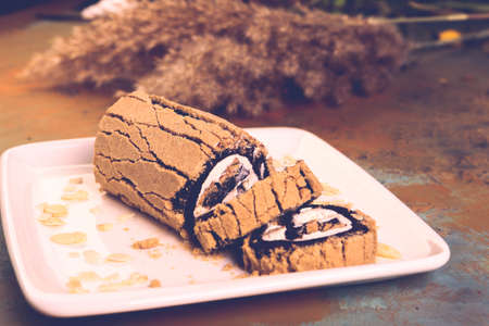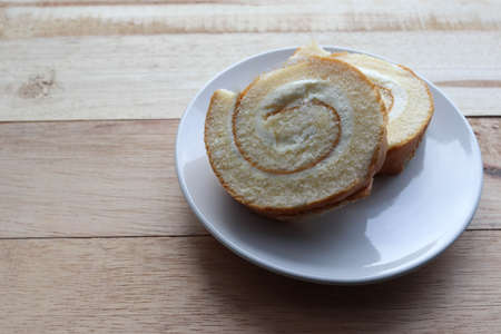 Cream roll cake sweet slices in white plate, delicious dessert isolated on wooden background closeup.