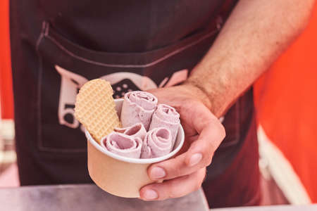 Stir-fried ice cream rolls at freeze pan. Rolled ice cream, hand made ice cream dessert. Fried ice cream machine with steel chilled pan.