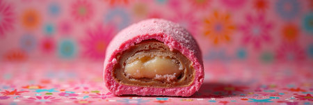 Pink japanese mochi dessert with sweet bean filling on floral background. That the image is generated using AI.