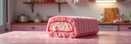 Sliced pink sponge cake with fluffy layers in modern kitchen interior. That the image is generated using AI.