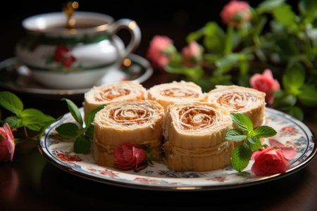 Roll cake cut into thin slices in an afternoon tea in Pernambuco, with flowers on the table., generative AI