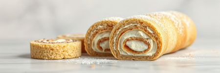 Delicious dessert roll with creamy filling and powdered sugar on marble countertop
