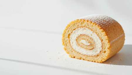A rolled cake filled with cream and topped with powdered sugar rests on a white surface.