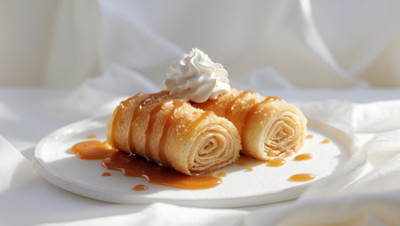 AI Generated. Delicious crispy rolls with sweet sauce and cream