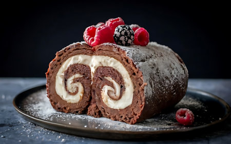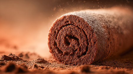 A luscious chocolate cake roll with a velvety exterior, generously coated in dark cocoa, revealing tender, swirled layers that promise sweet satisfaction and comfort