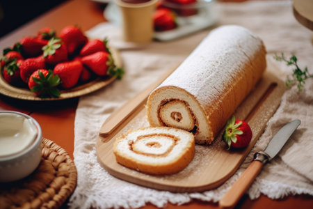 Strawberry roll cake with cream cheese filling and fresh strawberries, selective focus