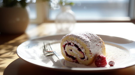 Cream roll cake with raspberries and icing sugar on a white plate