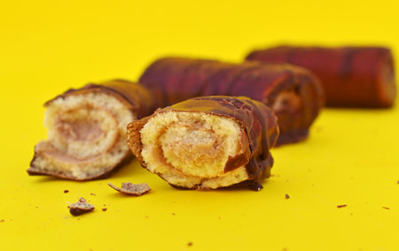 Mini Chocolate Cake Roll Swiss Roll on yellow background.