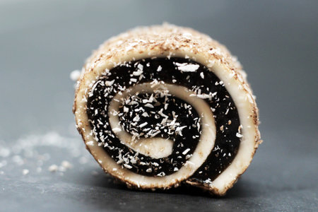 Chocolate sponge roll with a vanilla flavour filling, chocolate swiss roll, swirled cake