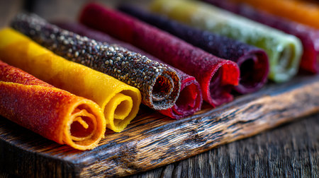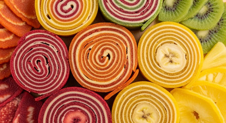 Colorful candied fruit rolls on a wooden board. Selective focus.