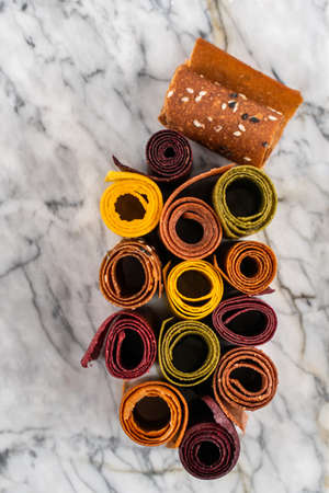 Sweet pure fruit pastille on a marble board. Natural sweets from berries and fruits in rolls. Useful sweets are pastilles, fruit chips. Dietary vitamin nutrition. Vegan food.