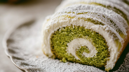 Close-up of a matcha roll cake with smooth cream filling and a light dusting of powdered sugar.