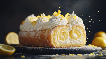 A fluffy sponge cake roll with swirls of lemon cream filling, garnished with lemon zest.