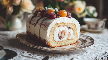 A sponge cake roll with cream and fruit filling, placed on a lace tablecloth for a vintage vibe.